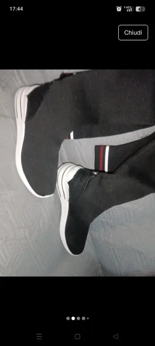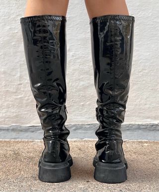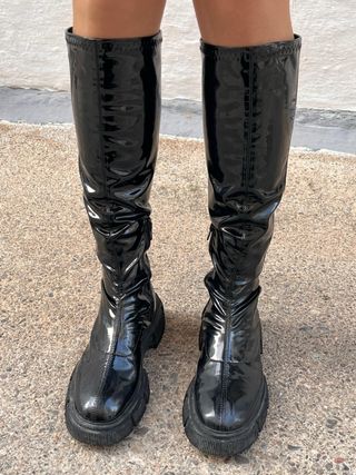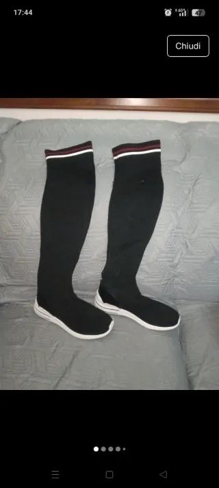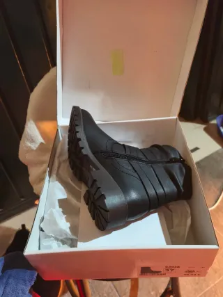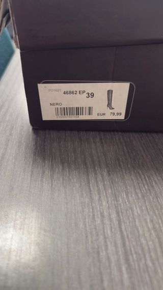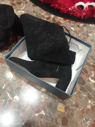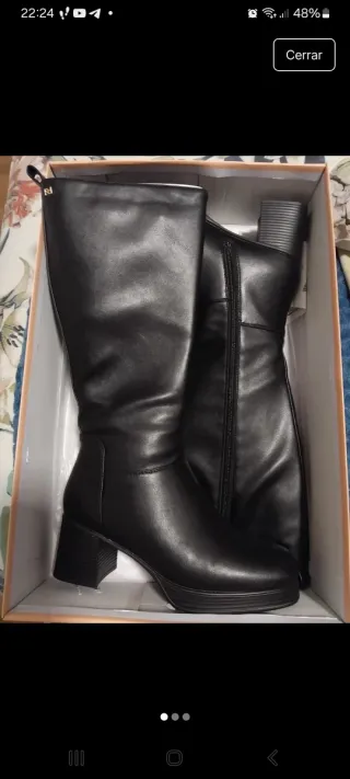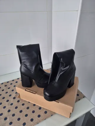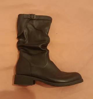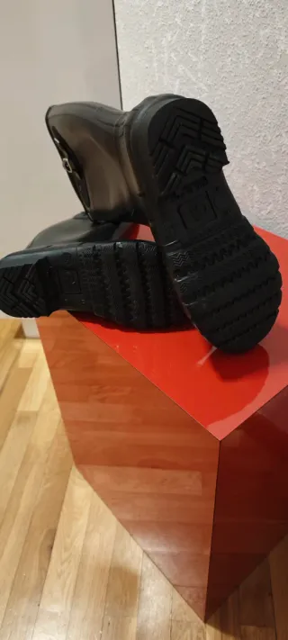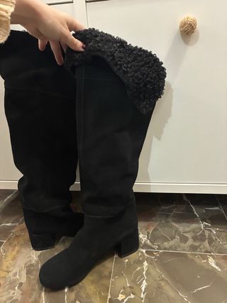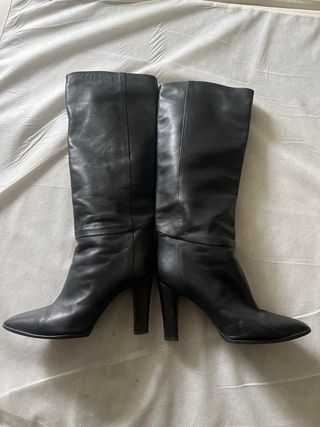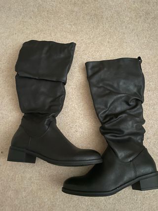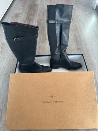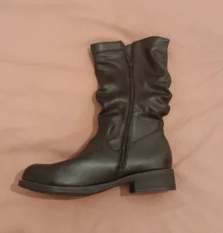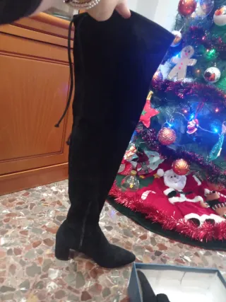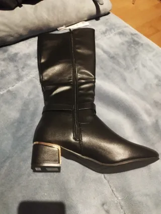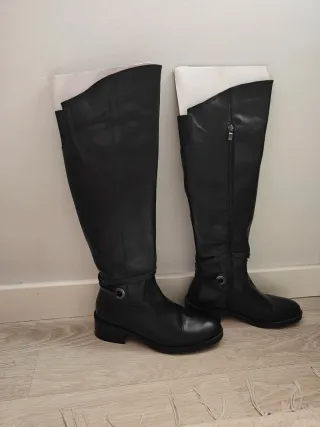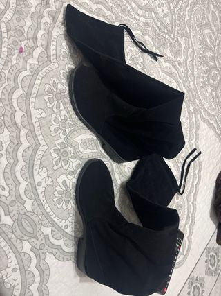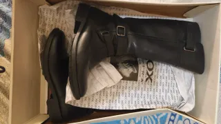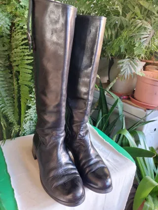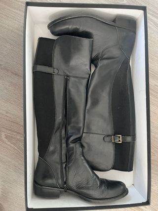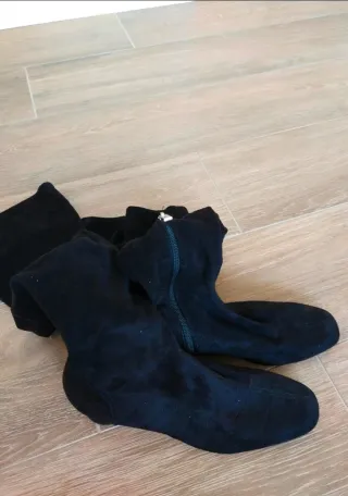Stivali alti in colore nero. - Cerniera laterale, l'altra laterale simulata. - Suola spessa. - Dettaglio di cinturino nella parte superiore. Usate una volta, super comode, mi piacciono, ma non mi vedo con quel look, sono impeccabili come se le comprassi nuove.