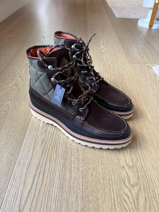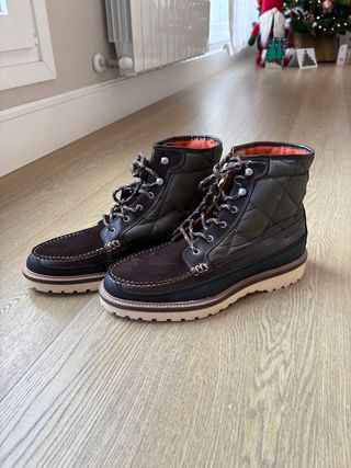 Stivali alti del marchio Gant. Design imbottito nella parte superiore. Combinazione di pelle scamosciata e materiale tessile. Laccetti marroni. Fodera interna arancione 100% lana.