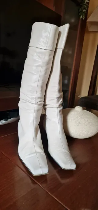 Stivali alti in pelle con un design elegante e moderno. - Materiale: Pelle - Colore: Beige - Gambale alto - Tacco sottile Lo stivale destro ha un piccolo sfregamento nella parte interna, si vede appena, foto allegata.