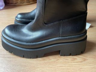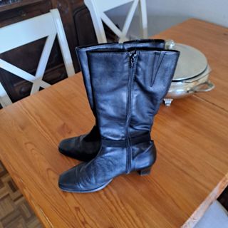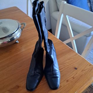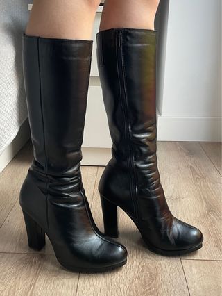 Stivali alti eleganti in pelle con un design moderno. In ottimo stato, tutte le imperfezioni sono visibili nelle foto. Non sono nuovi, li ho indossati e posso confermare che sono comodi. Altezza: 43,5 cm, tacco: 9,5 cm. Taglia: 37 (ideale per chi indossa 37-37,5). Paese di origine: Turchia. Materiale: pelle. Tipo di tacco: blocco. Chiusura: cerniera laterale.