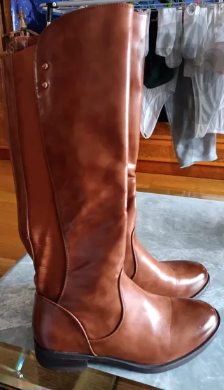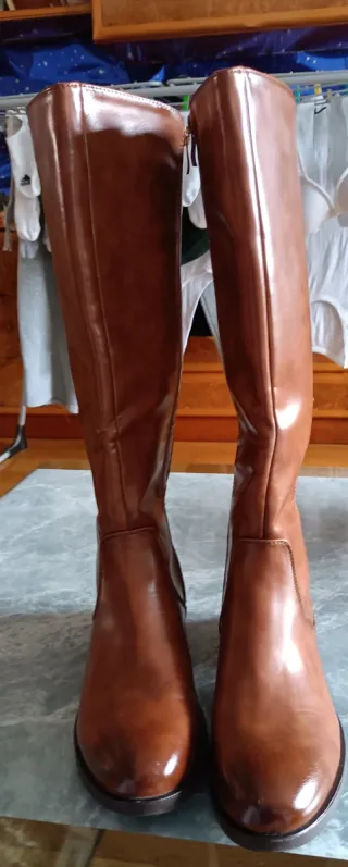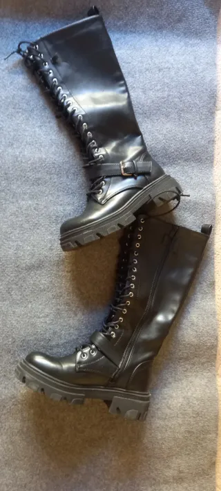 Stivali alti da donna. Design a stelo alto. Chiusura con lacci. Dettaglio con fibbia. Cerniera laterale. Suola spessa. È una taglia 39 ma potrebbe essere un po' stretta, anche se è comunque buona. Per chi indossa una 38 va perfettamente.