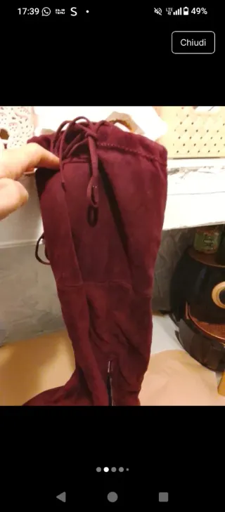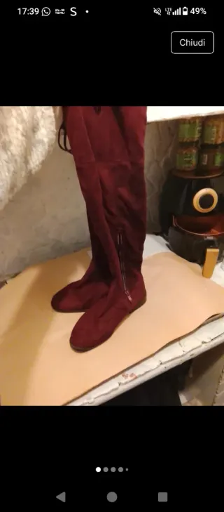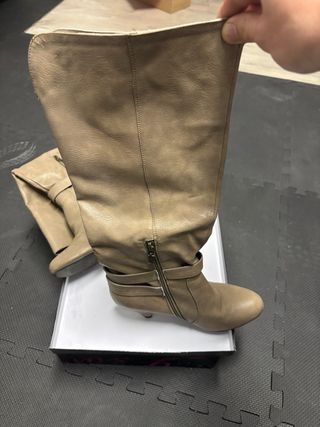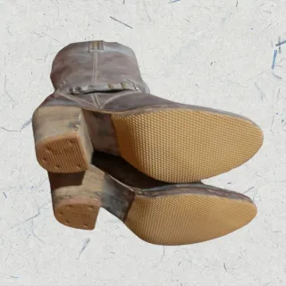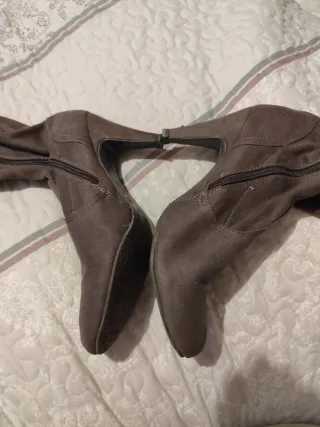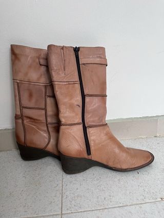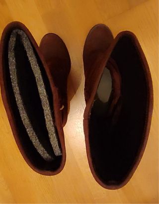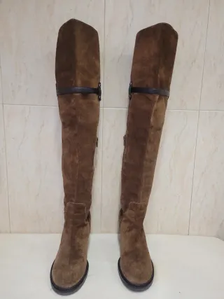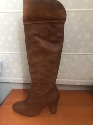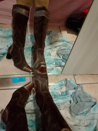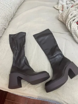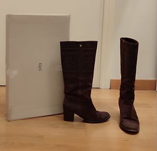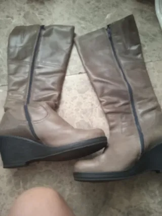 Stivali alti in pelle marrone grigiastra. Molto comodi. Utilizzati pochissimo. Uno degli stivali ha un leggero sollevamento del materiale nella parte posteriore del tacco (vedi foto). Tacco circa 9 cm. Materiale esterno in pelle scamosciata sintetica.
