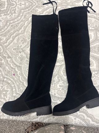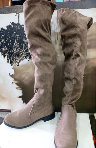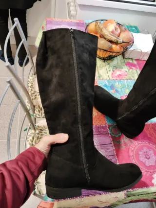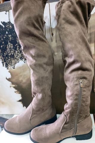 Stivali alti in stile moderno. - Materiale esterno tipo pelle scamosciata. - Tacco tondo. - Design che arriva sopra il ginocchio.