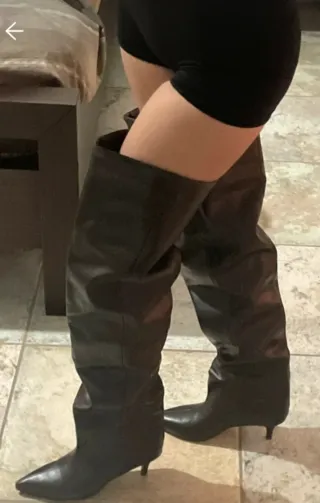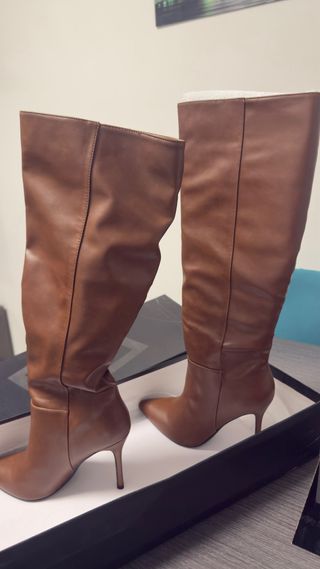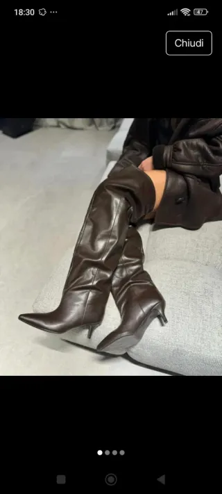 Eleganti stivali alti in ecopelle marrone. - Modello punta a stiletto. - Tacco sottile e comodo da 5cm - Design slouchy. Indossati 1 volta con scatolo.