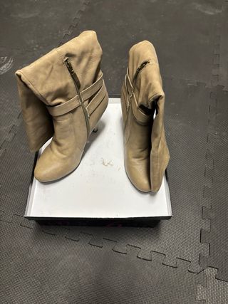 Stivali alti in pelle scamosciata nei toni del beige e del marrone. Un capo essenziale per il tuo guardaroba. - Materiale: Pelle scamosciata. - Design: Stivaletti alti. - Chiusura: Cerniera e laccio regolabile nella parte superiore.