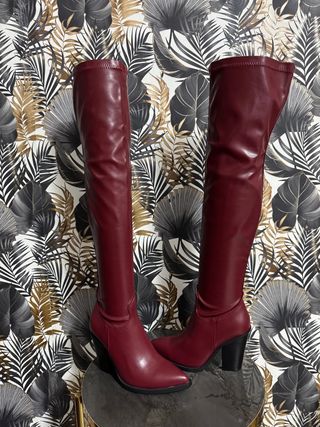 Botas altas de estilo elegante en color burdeos. - Tacón grueso y alto. - Punta fina. - Caña alta hasta la rodilla.