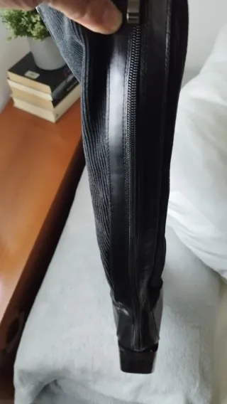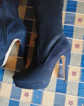 Stivali alla moschettiera in pelle di alta qualità. Molto comodi. Con piattaforma e tacco da 9 cm. Suole in gomma che li rendono più comodi da camminare. Taglia 36, ma io uso una 37 e mi vanno bene.