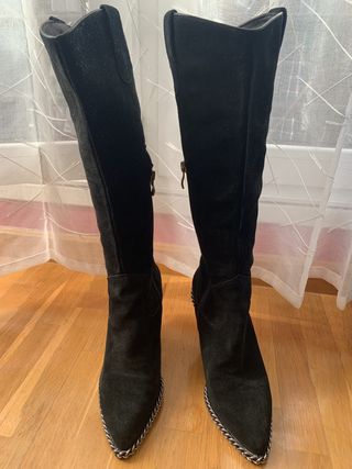 Stivali alti con zeppa bassa. Materiale esterno in pelle scamosciata. Cerniera laterale. Pannello elastico nella parte posteriore della gamba. Dettaglio con fibbia nella parte superiore.
