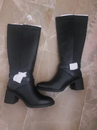 Stivali alti in stile moderno con tacco largo. Design con stelo alto. Dettaglio con cinturino e texture. Tacco grosso e squadrato. Taglia 38, colore nero, chiusura con cerniera, banda elastica perfetta per polpacci più generosi, nuovi, da indossare, con confezione originale.