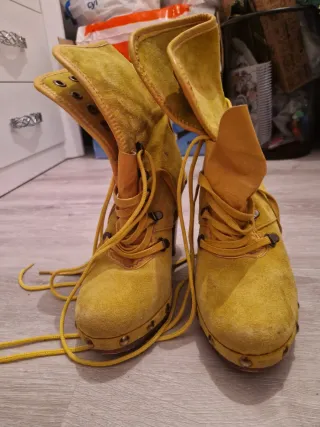 Stivali alti in pelle scamosciata gialla. Chiusura con lacci. Dettaglio borchie sulla suola. Gambale alto con piega. La marca è sconosciuta.