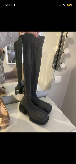 Stivali alti del marchio Zara con un design elegante. Effetto velluto. Fino al ginocchio. Cerniera interna. Colore nero. Dettaglio del tacco con finitura dorata. Cerniera laterale per facilitare l'accesso.