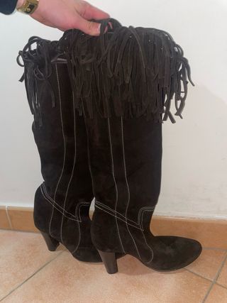 Stivali alti da donna in camoscio. - Dettaglio con frange sulla parte superiore. - Cuciture a contrasto bianche. - Tacco medio.