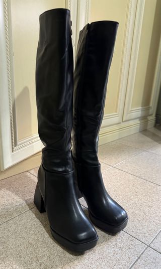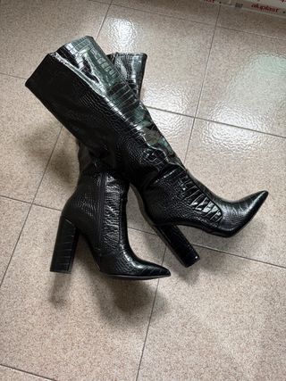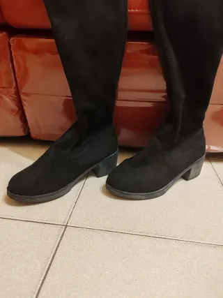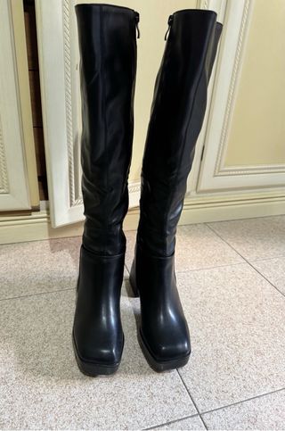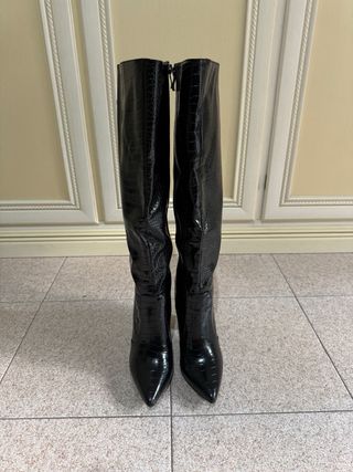 Eleganti stivali alti con tacco, perfetti per completare ogni outfit. - Materiale: similpelle. - Chiusura con zip laterale. - Punta affusolata. - Tacco largo e stabile.