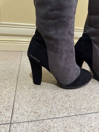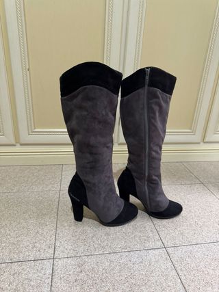 Stivali alti fino al ginocchio. - Materiale scamosciato. - Dettagli in pelle. - Tacco alto. - Colore grigio scuro con alternanza di nero.