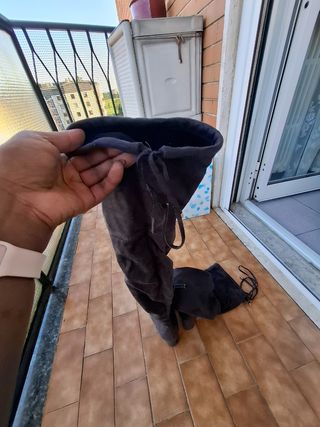 Stivali alti grigio in camoscio, usati ma in buone condizioni. Sono morbidi e comodi da indossare. - Stivali alti sopra il ginocchio - Chiusura con lacci - Materiale: camoscio - Colore marrone scuro - Un paio di stivali