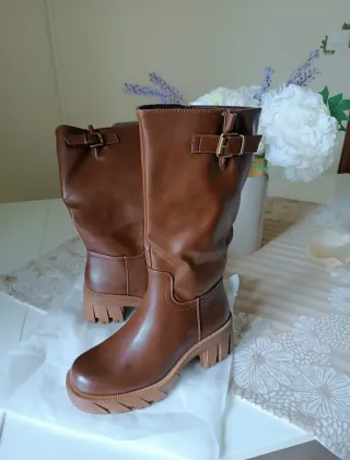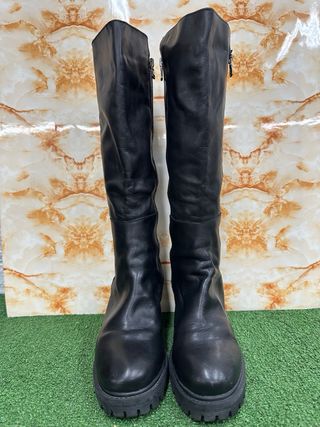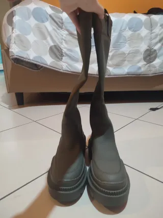 Stivali alti in ecopelle color verde oliva. - Suola chunky. - Design a punta tonda. - Zip laterale per facilitare la calzata - Vestono larghi - Perfetti per la pioggia - Caldi - I segni in foto sono eliminabili con la una pezzetta apposita - Nuovi, taglia sbagliata perché vestono larghi e non mi stanno bene purtroppo
