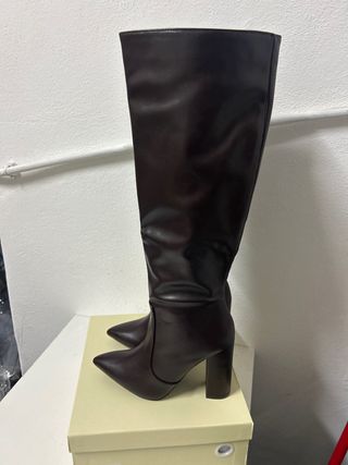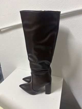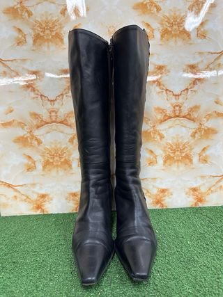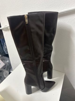 Eleganti stivali alti con tacco, perfetti per completare ogni outfit. - Materiale effetto pelle. - Punta affusolata. - Tacco squadrato. - Zip laterale per facilitare la calzata. lunghezza suola interna 23 cm tacco altezza 10 cm calzata regolare circonferenza 36 cm nuovi con scatola