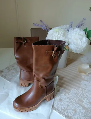 Eleganti stivali alti da donna, perfetti per completare ogni outfit. - Materiale: ecopelle - Dettaglio zip laterale - Fibbia decorativa - Suola platform circonferenza 38 cm, nuovo con scatola lunghezza suola interna 25 cm tacco 4 cm calzata regolare con zip