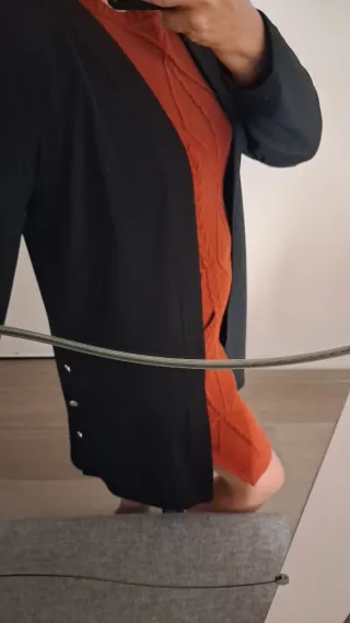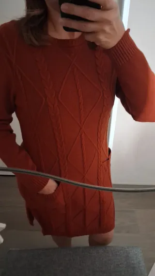 Abito invernale con un bel design a trecce e rombi. - Maniche lunghe. - Tasche laterali. - Lunghezza al ginocchio. Mini abito/Maxi Pull, a seconda dell'indosso. Calze doppie e stivali alti/leggings e tronchetto-stivali. L'indosso si riferisce ad 1.66 cm Morbido, caldo ed avvolgente. Paola Riva tg II-M Color mattone-tasche frontali funzionali. Spacchetti laterali. Scartellinato, ma non lo sento adatto alla mia fisicità, a malincuore, propongo e ad un prezzo irrisorio rispetto ai 39.90 pagati.