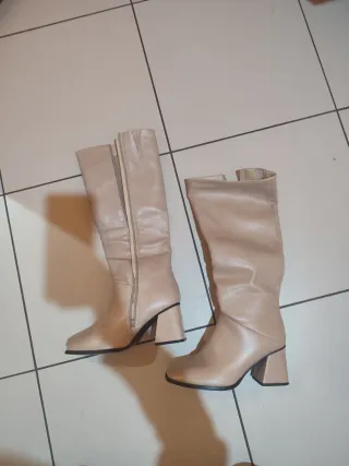 Eleganti stivali alti in ecopelle color beige, perfetti per completare ogni outfit. - Materiale: Ecopelle - Altezza tacco: 8 cm circa - Chiusura con zip laterale - Punta quadrata - 37 ma indossati anche da una 38 se avete bisogno delle misure precise scrivetemi - Molto caldi - I segni nella foto possono essere eliminati con una pezza apposita