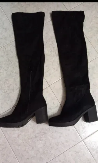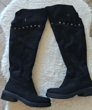 Eleganti stivali alti neri. - Materiale scamosciato. - Tacco largo. - Design sopra il ginocchio.