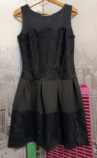 Delizioso vestitino nero con pizzo applicato sul petto e sulle balze della gonna a palloncino. Nuovo, acquistato durante un soggiorno a Parigi e mai indossato, Miss One taglia M. Valorizza le curve, corto al ginocchio, con cerniera lungo tutta la schiena. Ottima vestibilità e versatilità, si abbina bene a tacchi come a stivali alti o anfibi.