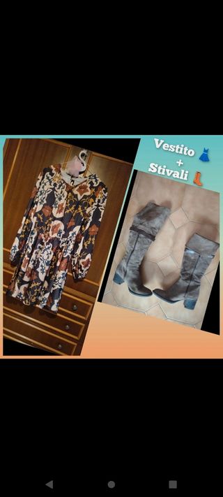 Set composto da abito e stivali in pelle Keys n 39 Vestito leggero (io l'ho utilizzato con collant e stivali), effetto raso, lucidino. Manica lunga con elastico al polsino. Elastico anche in vita (da qui la TU) 😉. Scollo rotondo. Chiusura posteriore con bottoncino. Lunghezza totale 90cm. Da ascella ad ascella 53cm. Giro vita (con elastico) da 32cm a 48cm, Dalla vita al fondo 45cm. Stivali scamosciati Keys marroni/beige. Alti al ginocchio con possibilità di fare il risvolto. Cerniera laterale e fascia elastica sul lato posteriore Tacco 6 cm. Presentano segni sul lato interno del tacco (il prezzo ne tiene conto)