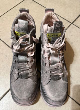 Stivaletti alti Buffalo con lacci e suola platform in ottime condizioni come evidenziato in foto , non sono più in possesso della scatola. - Tomaia in suede con dettagli metallizzati. - Interno foderato in tessuto. - Logo Buffalo sul tallone e sul passalaccio.