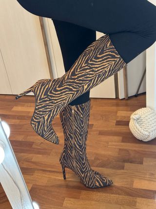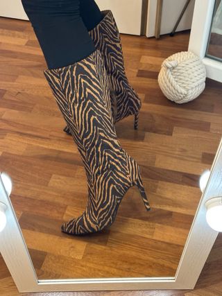 Stivali in camoscio con fantasia zebrata e tacco alto. Ottime condizioni, usati poche volte - Materiale scamosciato. - Fantasia animalier. - Zip laterale per chiusura.