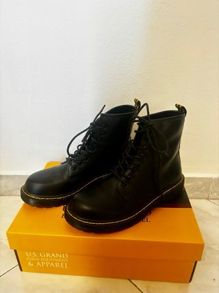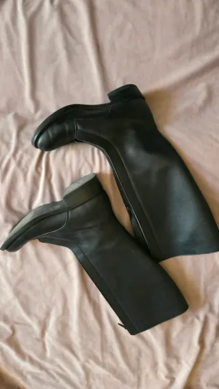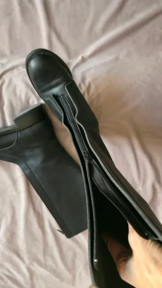 Eleganti stivali neri in pelle vegana, perfetti per completare ogni outfit. Stile accattivante tipo anfibi. - Materiale pelle vegana. - Chiusura con zip centrale. - Suola in gomma. Ottimi per la poggia. La misura indicata è 38 ma calze piccolo, è un 37 reale. Made in Portogallo, ottima qualità In perfette condizioni.