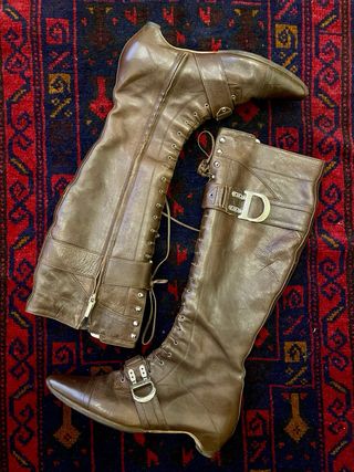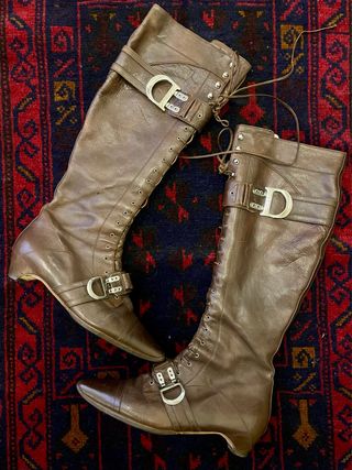 Stivali alti in pelle marrone, un pezzo iconico della sfilata Dior x John Galliano del 2005. Vintage Dior x John Galliano Runway 2005 Lace-Up Knee Boots. Very rare pair with a small number for sale worldwide. Timeless silhouette, a very interesting heel and two straps with the Dior logo. An amazing pair of boots. Perfect for any season. Presents signs of wear but the condition is very good. The soles have rubber protection on. Size 39. Fits TTS. Ask for any additional information as well as the photographs.