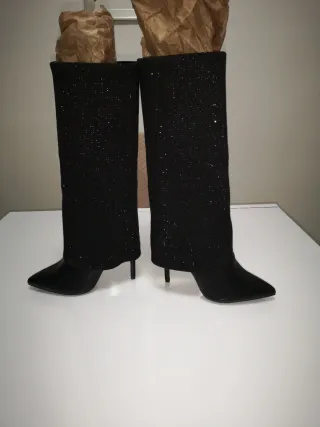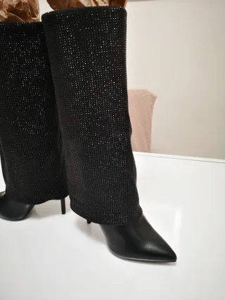 Eleganti stivaletti da donna con un design unico. Numero di scarpe 39 no lacci - Decorati con strass scintillanti. - Dettagli metallici dorati. - Tomaia in tessuto e pelle.