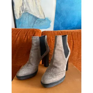 Tod's ankle boots in pelle scamosciata color cammello/marrone chiaro, con dettagli brogue e tacco alto. In condizioni perfette e usati pochissimo, inclusi di scatola originale e cartoncino del brand con certificato. Assolutamente perfetti per ogni occasione, taglia 38 e mezzo. Come nuovi. Modello: Gomma T 100 OJ Eleganti e originali stivaletti Tod's in pelle scamosciata beige con dettagli traforati e inserti laterali elasticizzati. Tacco alto e robusto e suola in gomma.