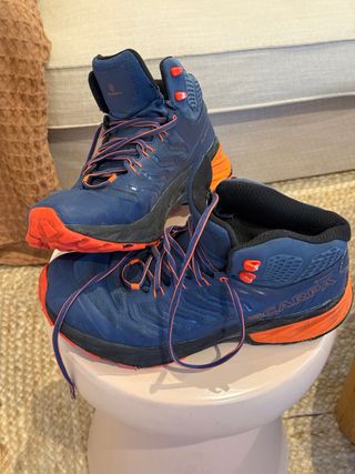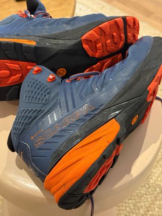 Stivali da trekking Scarpa Rush Mid GTX in colore blu e arancione. Progettati per offrire comfort e protezione nelle tue avventure all'aperto. Sono taglia 46, si trovano usati ma in ottime condizioni. Canna media per una maggiore tenuta. Membrana GORE-TEX per impermeabilità. Suola in gomma per un'aderenza ottimale. Chiusura con lacci.