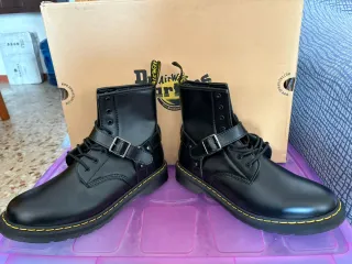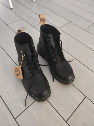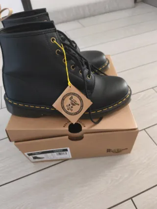 Stivali Dr. Martens in versione vegana, un classico rivisitato. - Materiale completamente vegano. - Design iconico a 8 occhielli. - Suola con cuciture gialle. - Etichetta Vegan applicata. Nuovi mai usati si vede dalla suola
