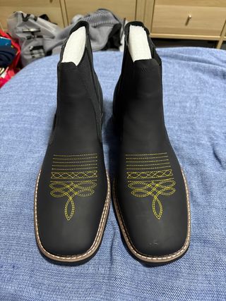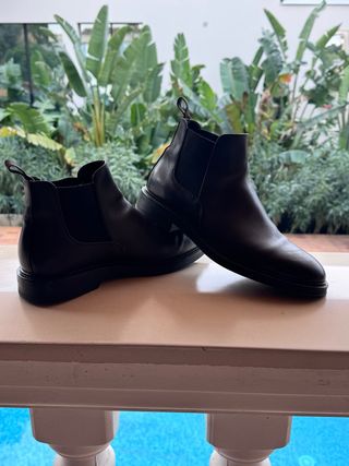 Stivali in pelle da uomo. Design elegante e versatile. Chiusura con cerniera. Tacco quadrato. Ha due piccoli segni sulla scarpa destra, visibili in una delle immagini.