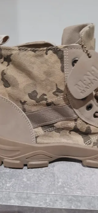 Stivali in stile militare con un design moderno e funzionale. Perfetti per attività all'aperto o per un look urbano. Combinazione di toni beige e camouflage. Chiusura con lacci. Gambale alto per una maggiore tenuta. Suola in gomma resistente.