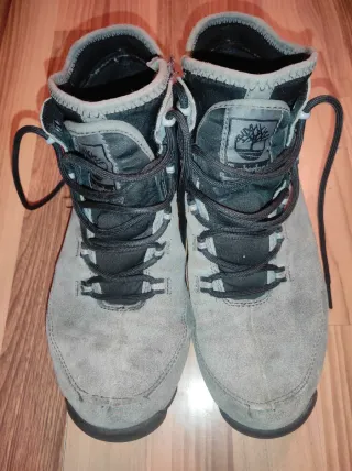 Stivali Timberland grigi, perfetti per l'escursionismo o l'uso quotidiano. - Materiale esterno in pelle scamosciata. - Chiusura con lacci neri. - Dettaglio del logo Timberland sulla linguetta. - Collo imbottito per una maggiore comodità.