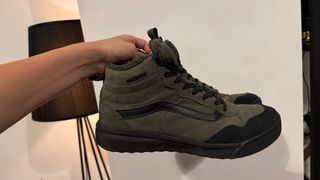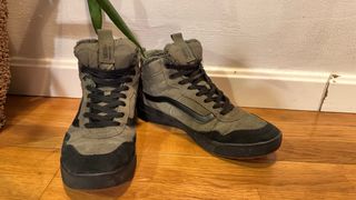 Stivali invernali da uomo della marca Vans. Design a stelo alto, dettaglio di fodera interna, combinazione di colori verde e nero. Con segni d'uso ma in buone condizioni.