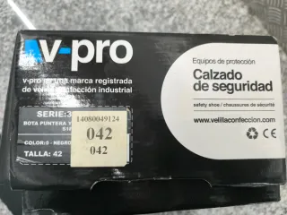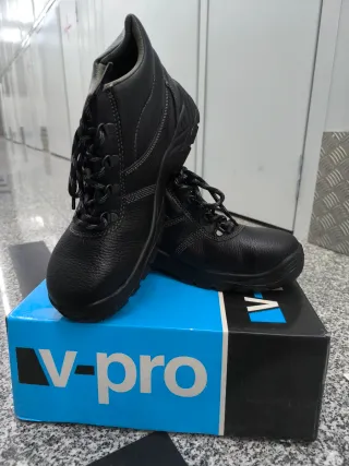 Stivali di sicurezza della marca V-pro in taglia 42. Progettati per offrire protezione e comfort. Materiale esterno in pelle. Chiusura con lacci. Suola antiscivolo.