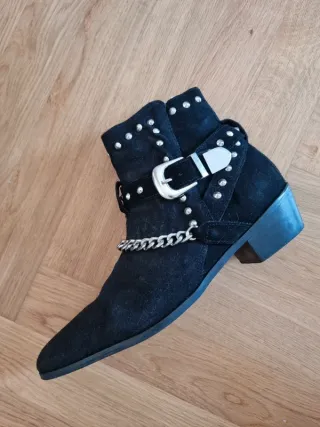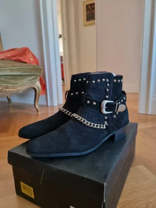 Stivaletti alla caviglia, scamosciati di palle nera, con borchie, fibbia e catena. - Decorati con borchie argentate. - Cinturino con fibbia metallica. - Catena decorativa sul collo del piede. - Punta affusolata. Topman, taglia 9/EU 42 Indossato una sola volta, praticamente nuovi e perfetti.