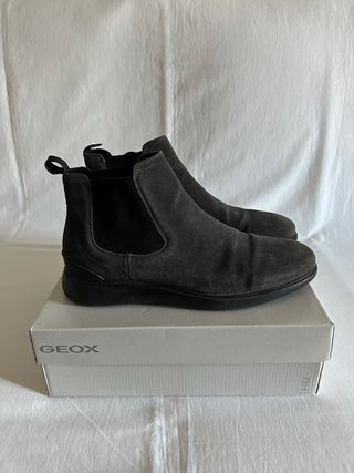 Preciosos botines Geox, de ante y color gris oscuro con suela negra. Talla 45 IT. El largo de la suela se destaca en la última foto para una mejor apreciación. Estos botines se han usado pocas veces y se encuentran en perfecto estado, con solo algunas pequeñas marcas. Ideales para quienes buscan unos botines clásicos que combinen con diversos atuendos formales e informales.