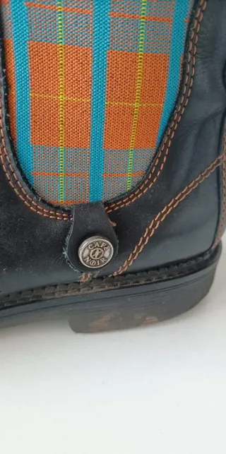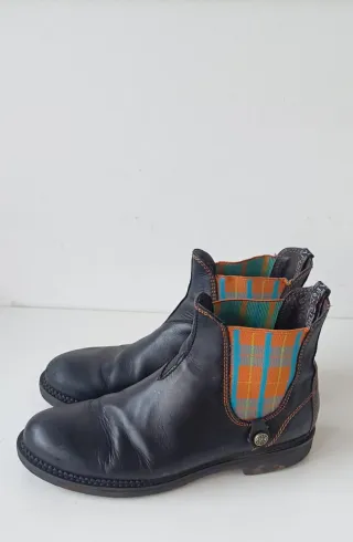 Stivaletti in pelle Cafènoir con un tocco di colore. In buone condizioni con segni di usura vedi foto Per più informazioni scrivetemi - Design unisex. - Inserti interni a fantasia. - Dettagli con cuciture a vista.