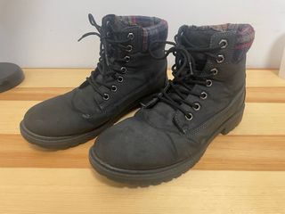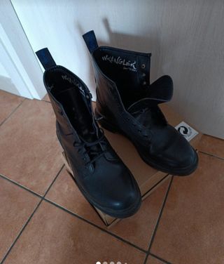 Scarponcini tipo dr. Martens, non originali, colore verde bottiglia. Imbottiti all'interno, perfetti per l'inverno e per le giornate di pioggia perché in ecopelle con suola di gomma. Mai indossati. Nuovi. Tg. 45 (vestono piccole in quanto imbottite quindi 44 massimo 44,5)