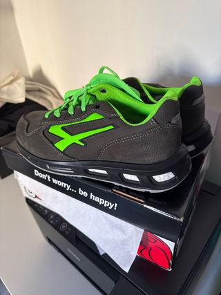Scarpe U-Power con un design moderno e accattivante. - Tomaia in resistente materiale grigio. - Dettagli e lacci in vivace colore verde. - Suola robusta per un comfort duraturo.