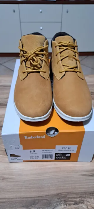 Scarponi Timberland in pelle scamosciata, colore marrone. Sono nuovi, mai usati. - Modello alla caviglia - Lacci color bordeaux - Suola robusta