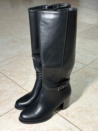 Eleganti stivali neri alti fino al ginocchio, perfetti per completare ogni outfit.comodissimi con tacco quadrato di 8.5cm e comoda zeppa di 2cm - Dettaglio cinturino con fibbia. - Tacco robusto e plateau. - Zip laterale per facilitare la calzata.