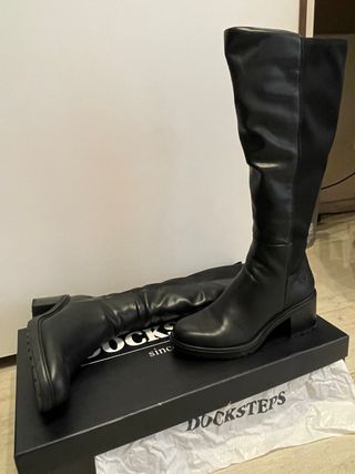 Eleganti stivali alti e neri di marca Docksteps, con materiale esterno in similpelle e inserti laterali elasticizzati. La suola è in gomma con tacco e il design è moderno e versatile. Sono praticamente nuovi, in perfette condizioni, vendo solo per errore nella scelta del numero