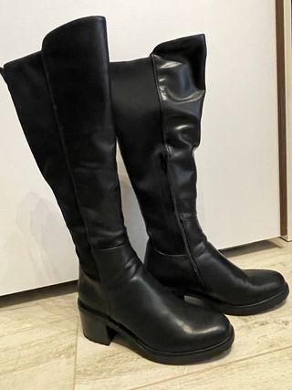 Stivali alti in morbido tessuto effetto scamosciato. Colore nero. Modello over the knee che arriva sopra il ginocchio. Tacco alto cm. 3. Misura 38. Indossati solo un paio di volte