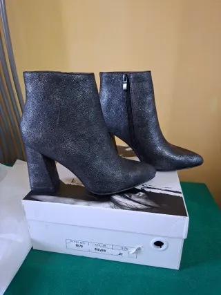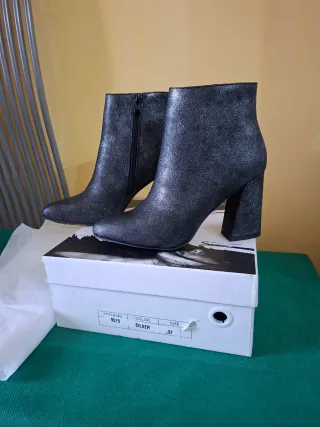 Eleganti stivaletti con un design moderno e un tocco scintillante. Colore nero silver. Numero 37. - Materiale effetto metallizzato. - Zip laterale per una facile calzata. - Tacco robusto e squadrato. Nuovi con confezione ( disponibile anche il 36 )